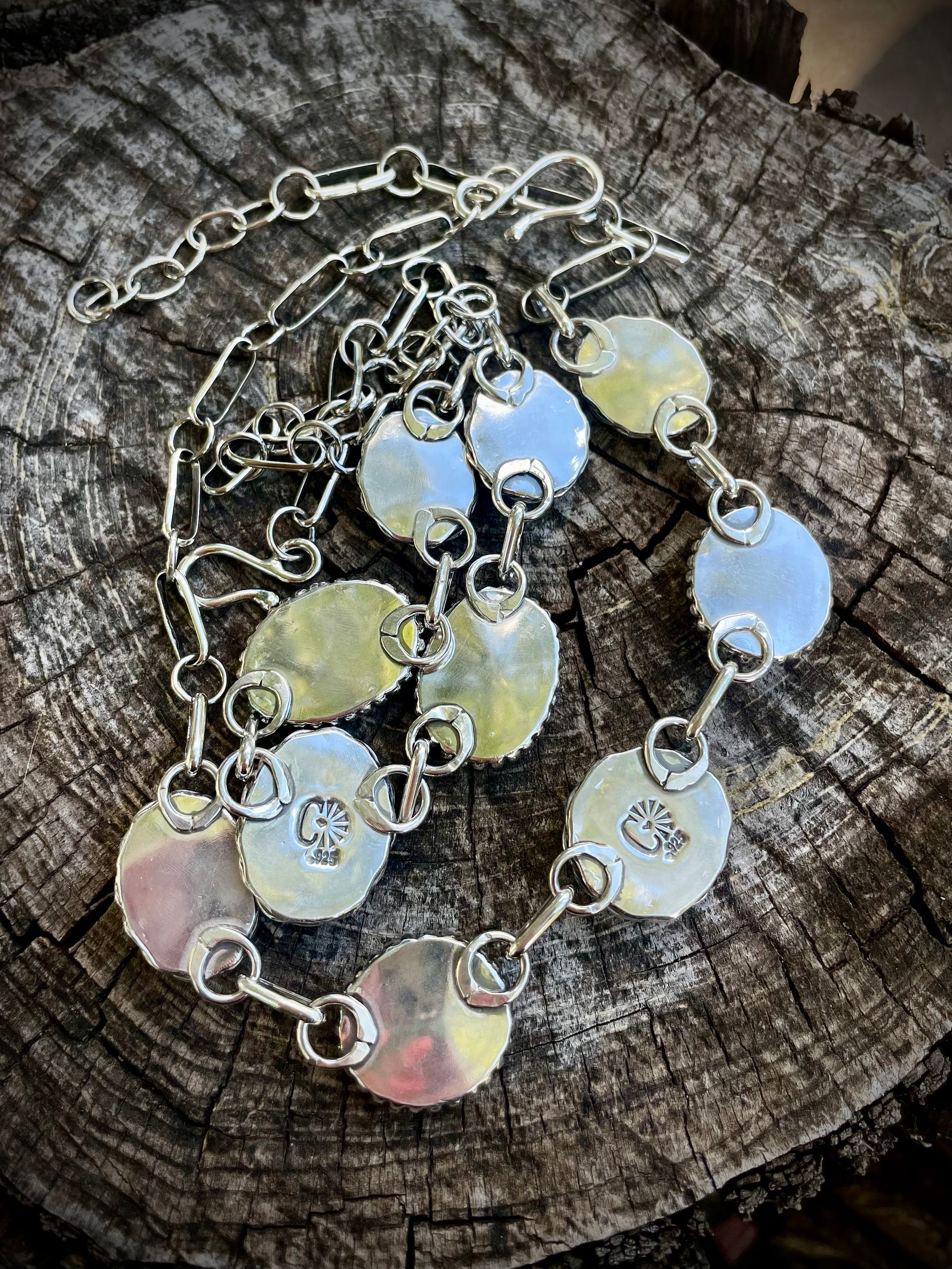 Always hand set in sterling and fine silver, stamped .925 and my maker’s mark. Every single link and hook are all hand made by me 🩵