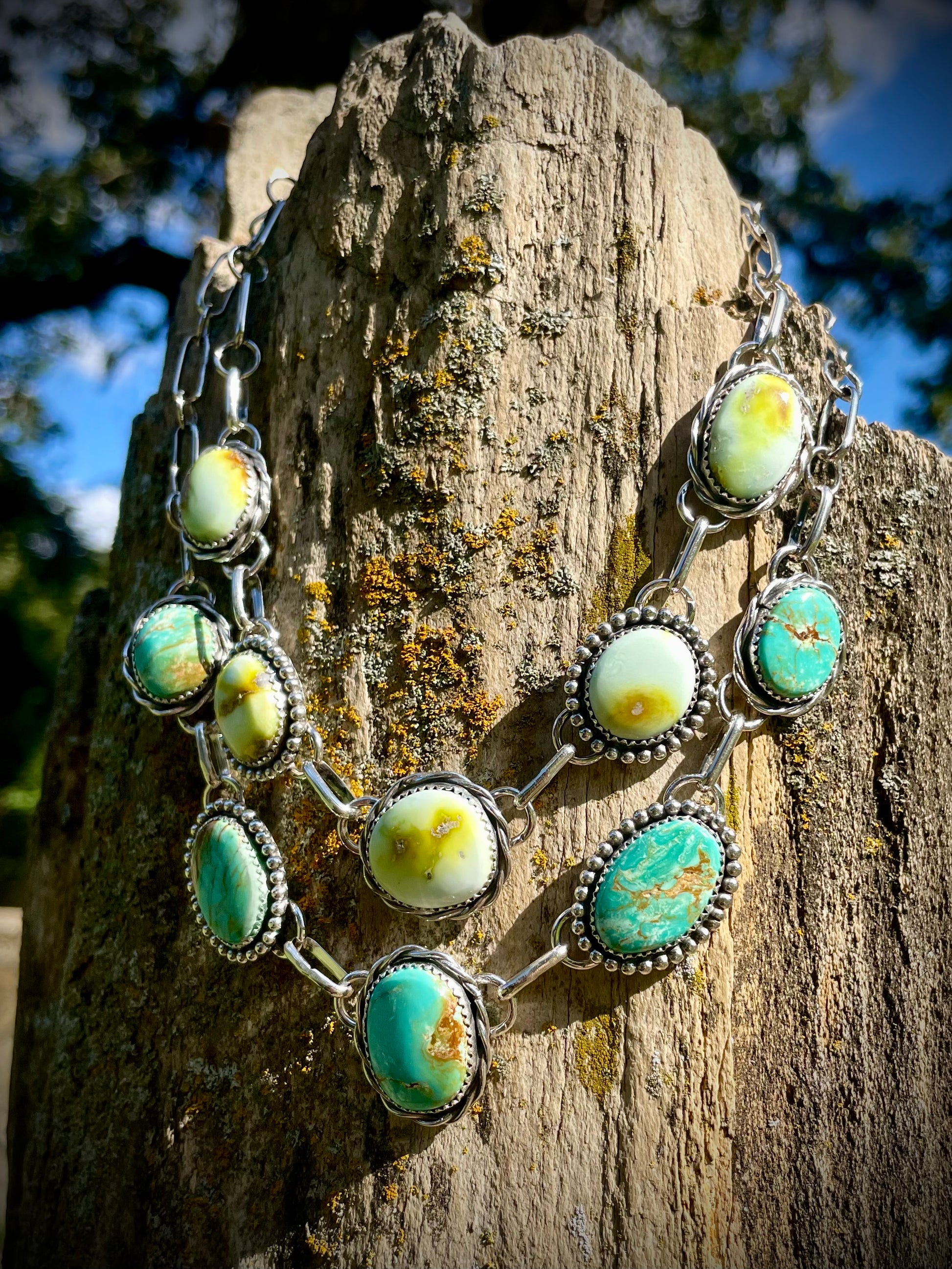 Hidden Valley turquoise is a hair over 16” total length, priced at $475.