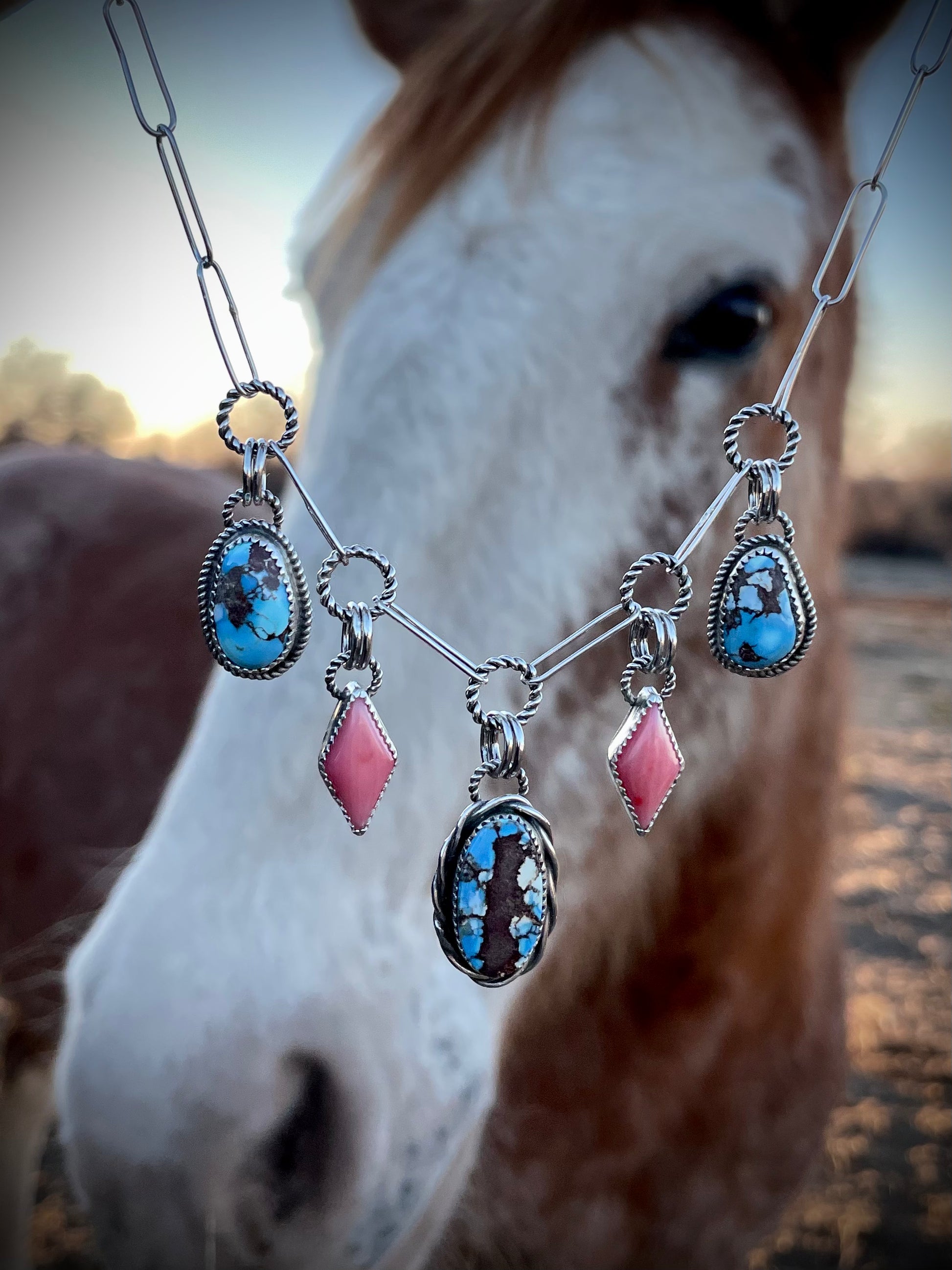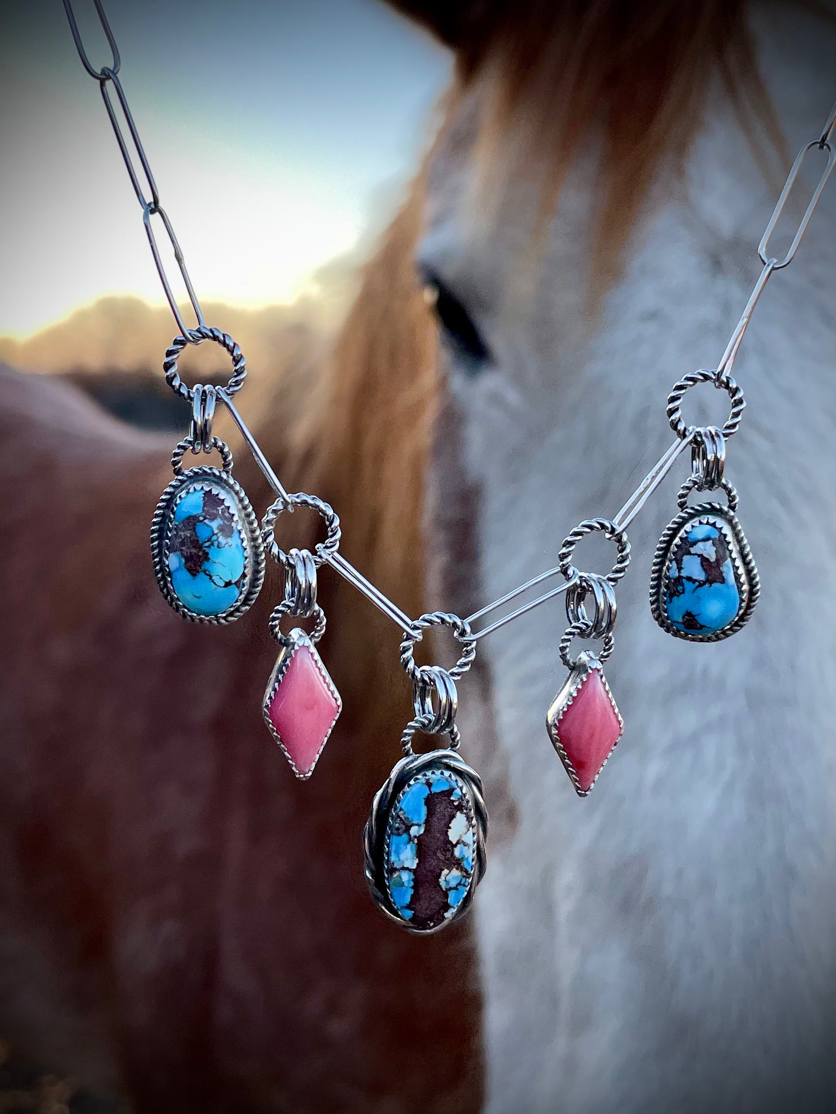 I made a pretty today! Charm necklaces always give me gypsy sort of vibes, so I guess you could say this is dainty gypsy meets feminine western… I had the pink coral stones laid out to make earrings, but when they got pushed next to the Golden Hills on my workbench, I felt like the pairing was too perfect not to put them together!
