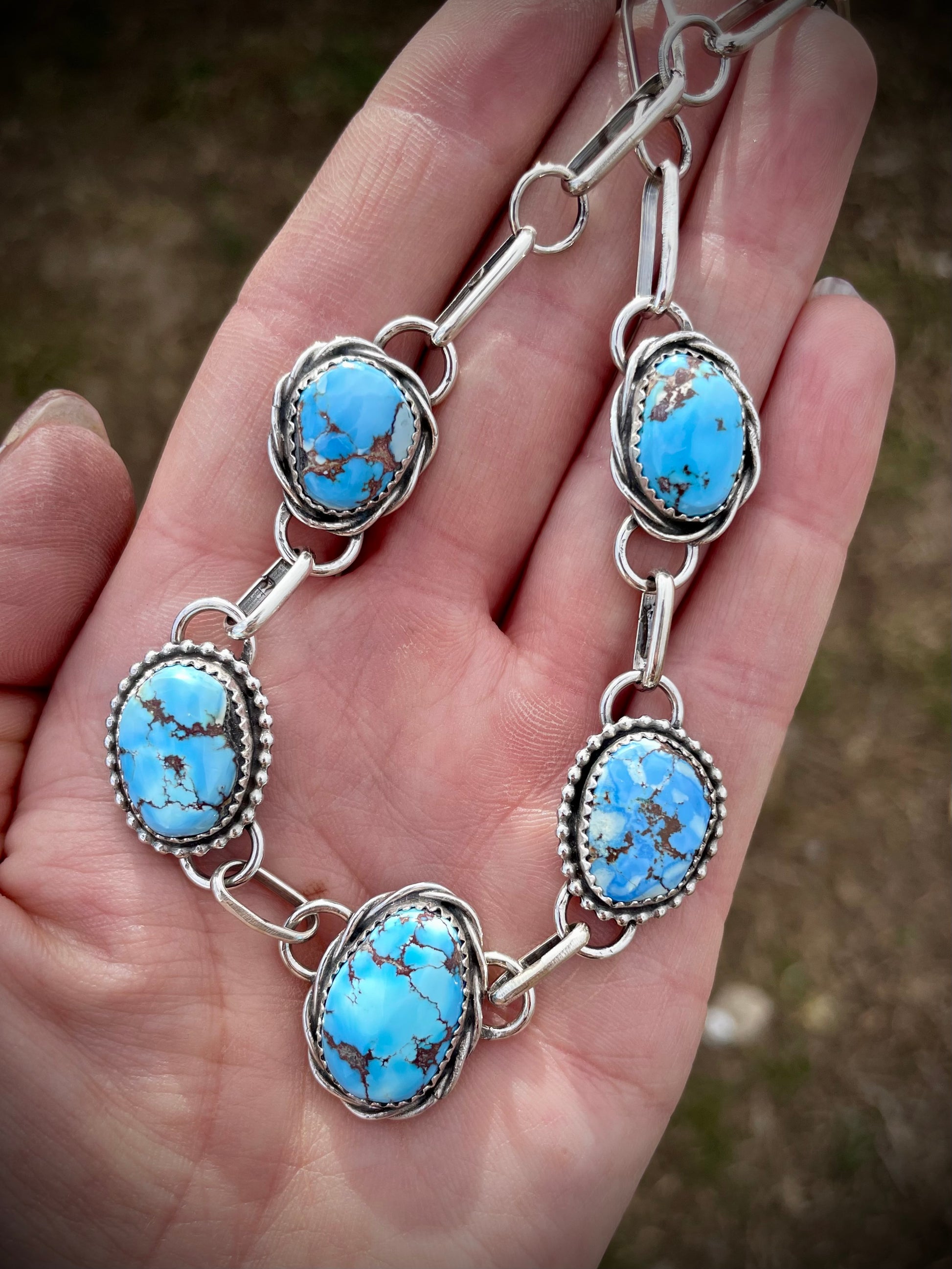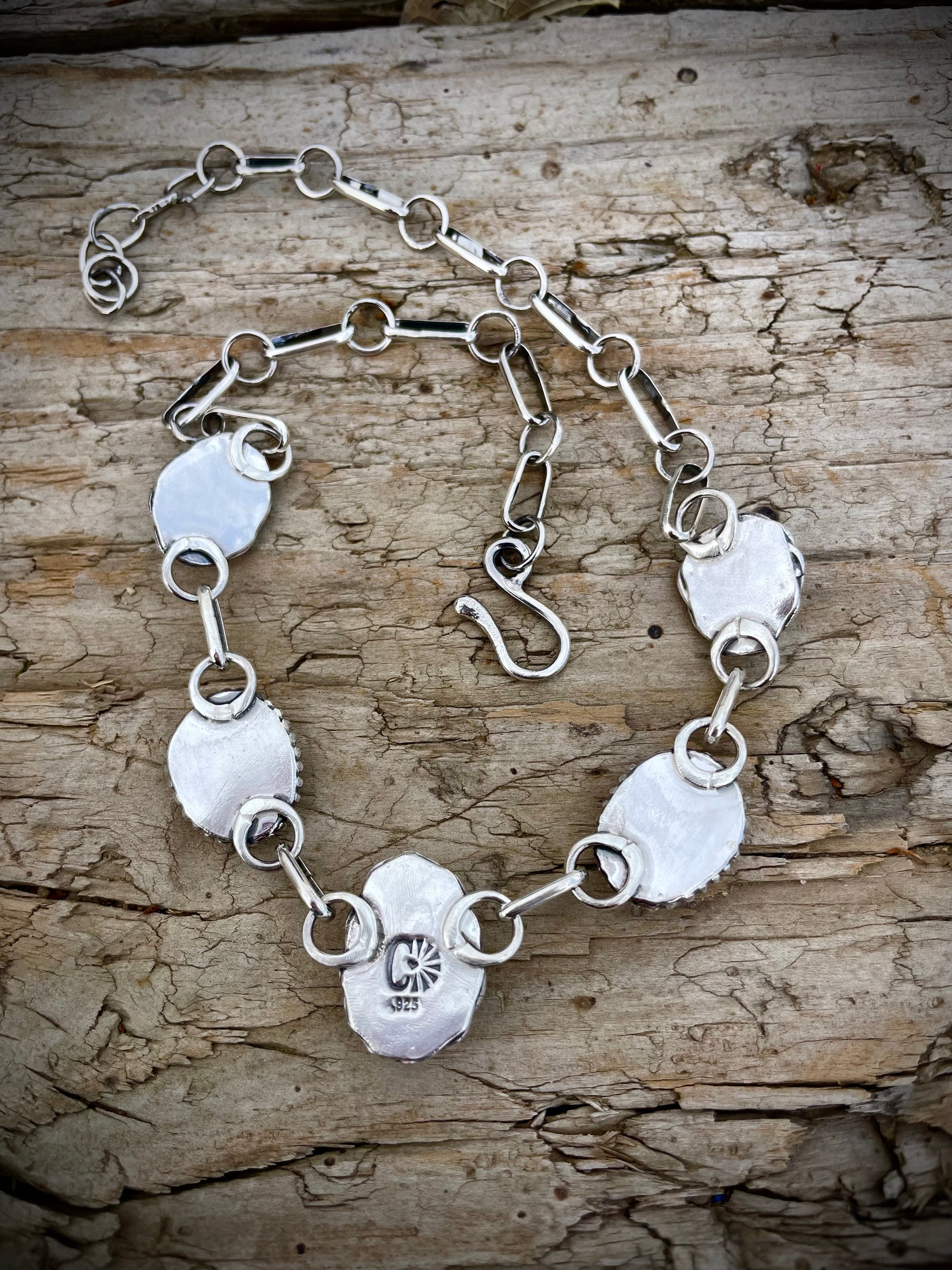 Always hand set in sterling and fine silver, stamped .925 and my maker’s mark. Every single link and hook are all hand made by me 🩵