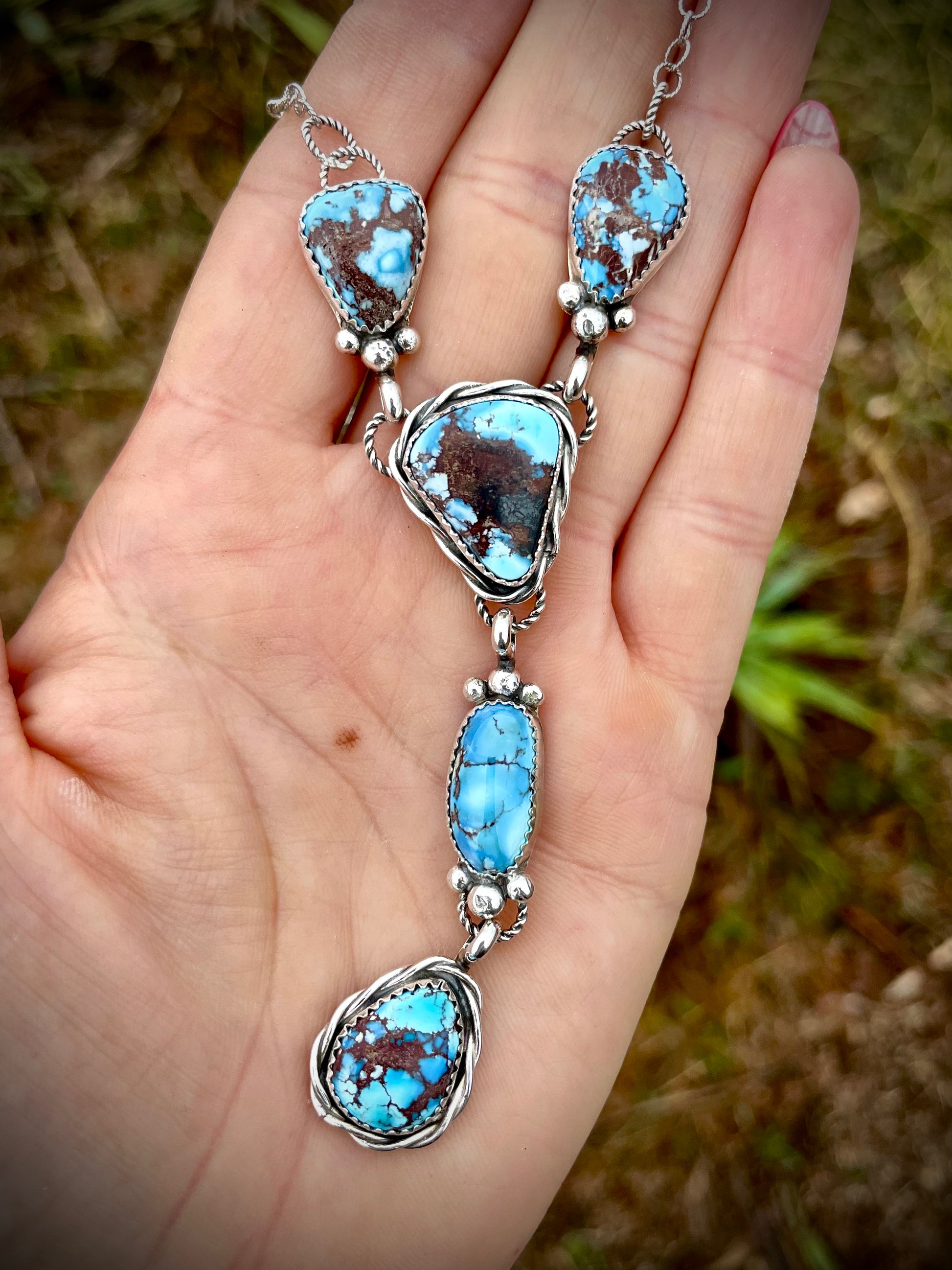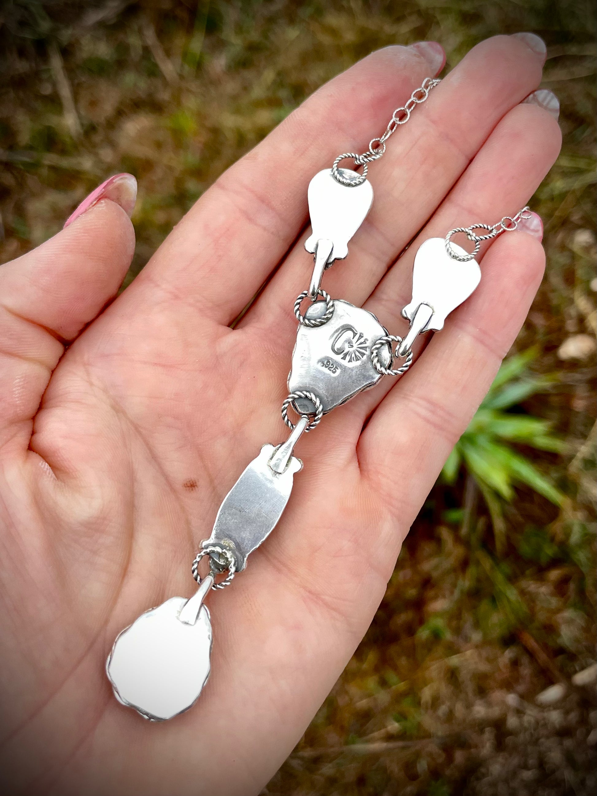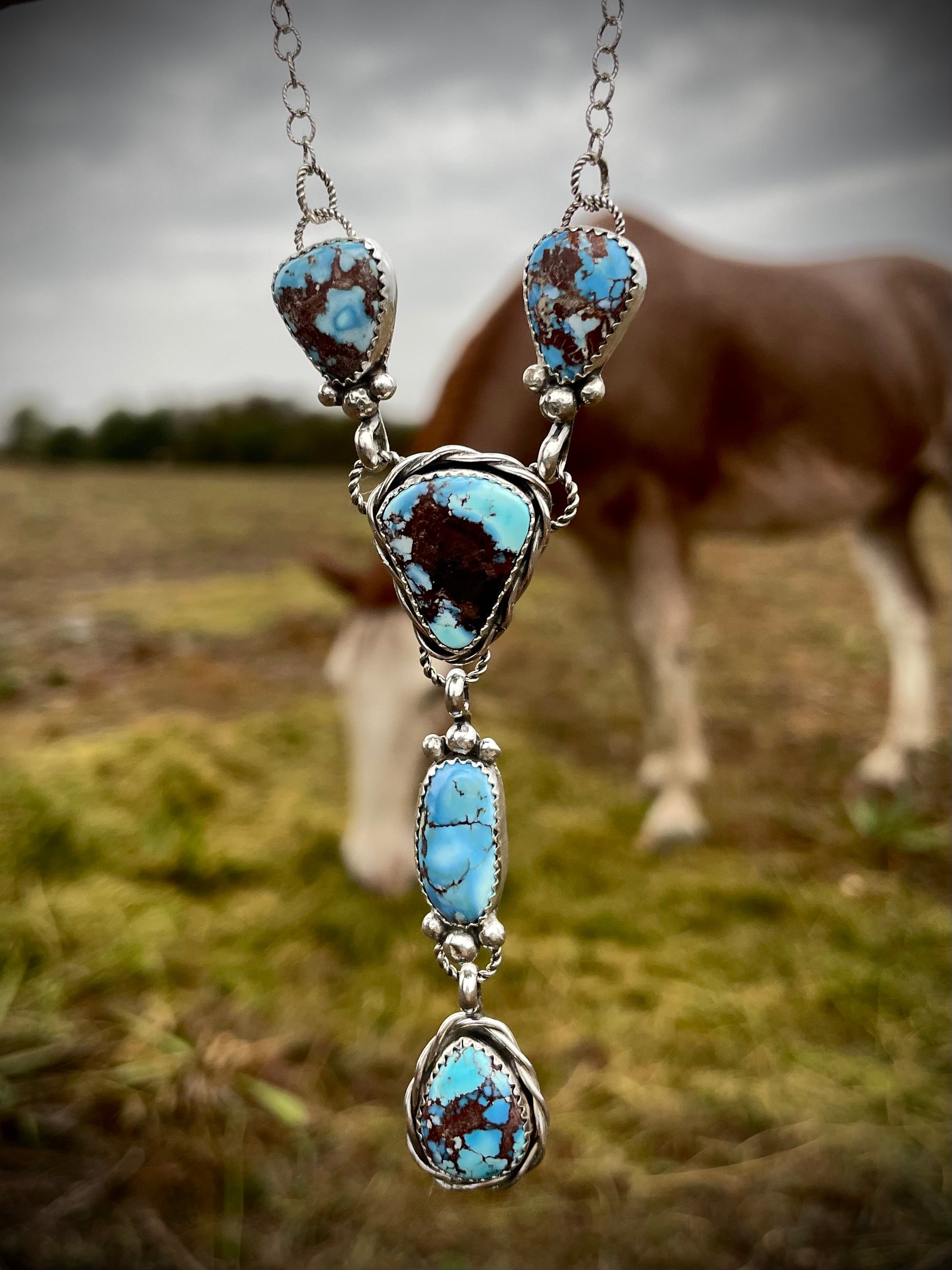 Spent this rainy day in my studio, and I’m quite pleased with what I got done! This Golden Hills lariat is a touch of dainty, but also a touch of statement piece! Always hand set in sterling and fine silver, stamped .925 and my maker’s mark.