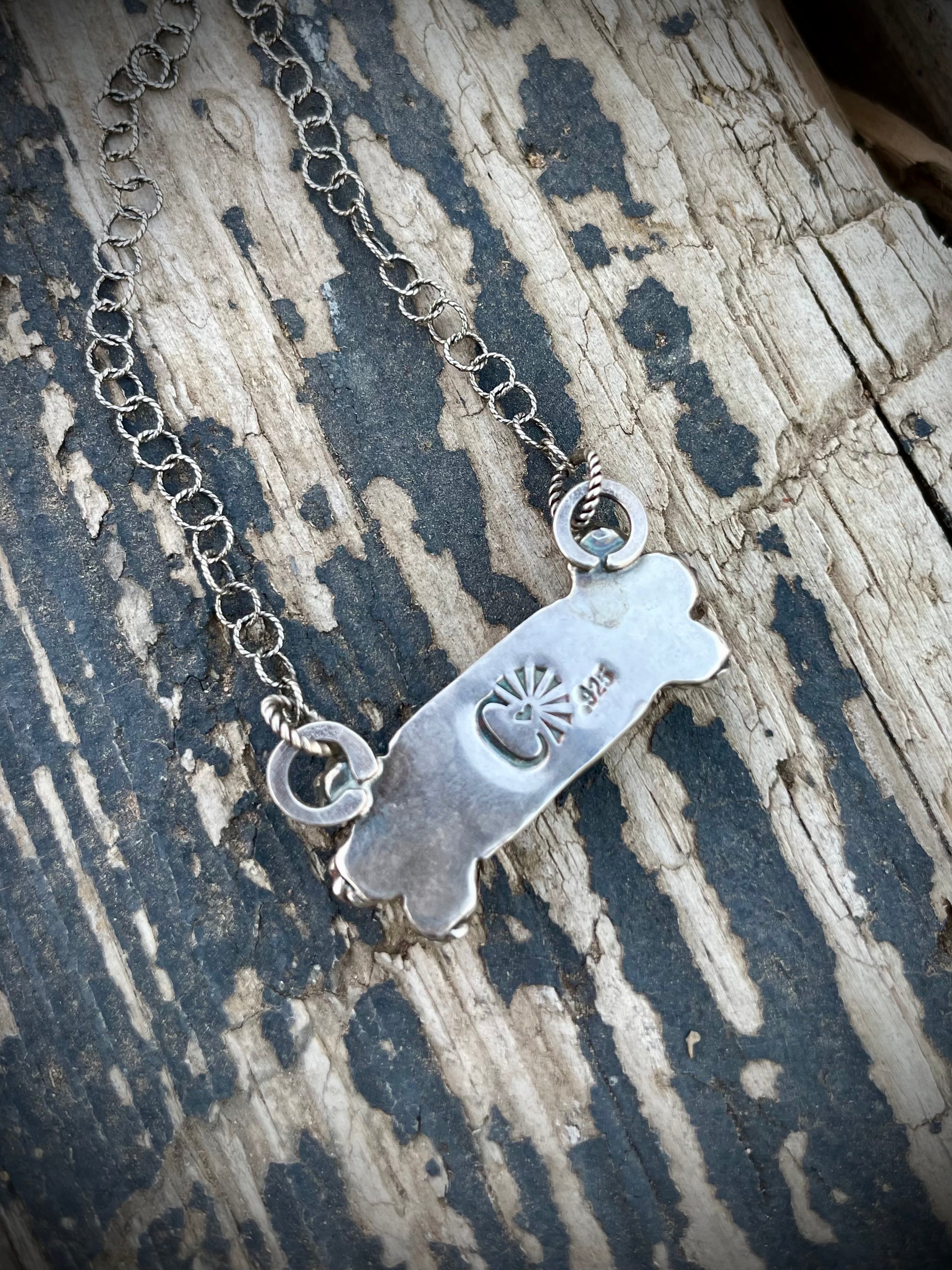 Talk about the perfect piece for every day wear! Dress it up and head to dinner, or wear it to the roping area and turn steers for your grouchy husband; this dainty piece stays comfy all day! These stones are pink Peruvian Opal / Kingman Mojave, and oh so pretty! Hand set in sterling and fine silver, stamped .925 and my maker’s mark. All chains are also sterling.